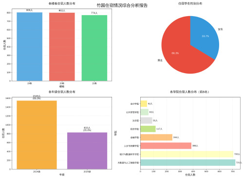 竹园“一站式”学生社区由大数据与人工智能学院牵头建设,含 19 栋、20 栋、21 栋三栋宿舍楼,实行男女分栋管理机制 ——19 栋(806 人)与 21 栋(774 人)为男生专属宿舍,20 栋(802 人)为女生专属宿舍,三栋楼宇人数分布均衡(774-806 人)。住宿总规模达 2382 人,其中男生 1580 人(占比 66.3%)、女生 802 人(占比 33.7%),男女生比例约 2:1;年级构成上2024 级1549 人,占比 65%,2025 级833 人,占比 35%。
