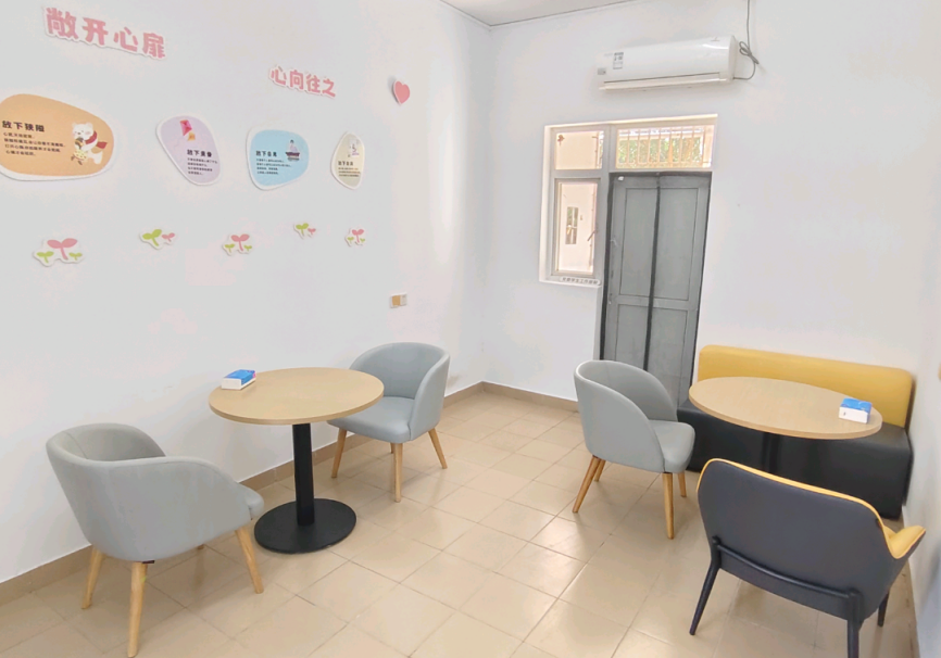 适合进行谈心谈话,可容纳6人,室内配备舒适桌椅(四张凳子、一张双人沙发),为大家提供安静、私密的沟通空间。