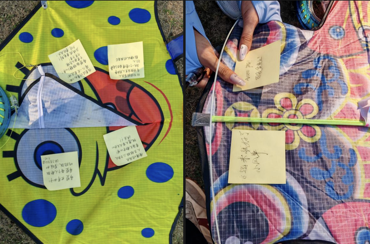 随后,同学们将写满文字的便利贴小心地贴在风筝上,接着自由成组,默契配合放飞风筝。放飞过程中,一人手持风筝迎风奔跑,试图让风筝在风中扶摇直上,另一人则负责拍照、录视频,记录下这充满活力与希望的瞬间。风筝带着同学们的烦恼越飞越高,仿佛将所有的压力都抛向了云霄,而梦想也随着风筝在空中翱翔,愈发清晰。
