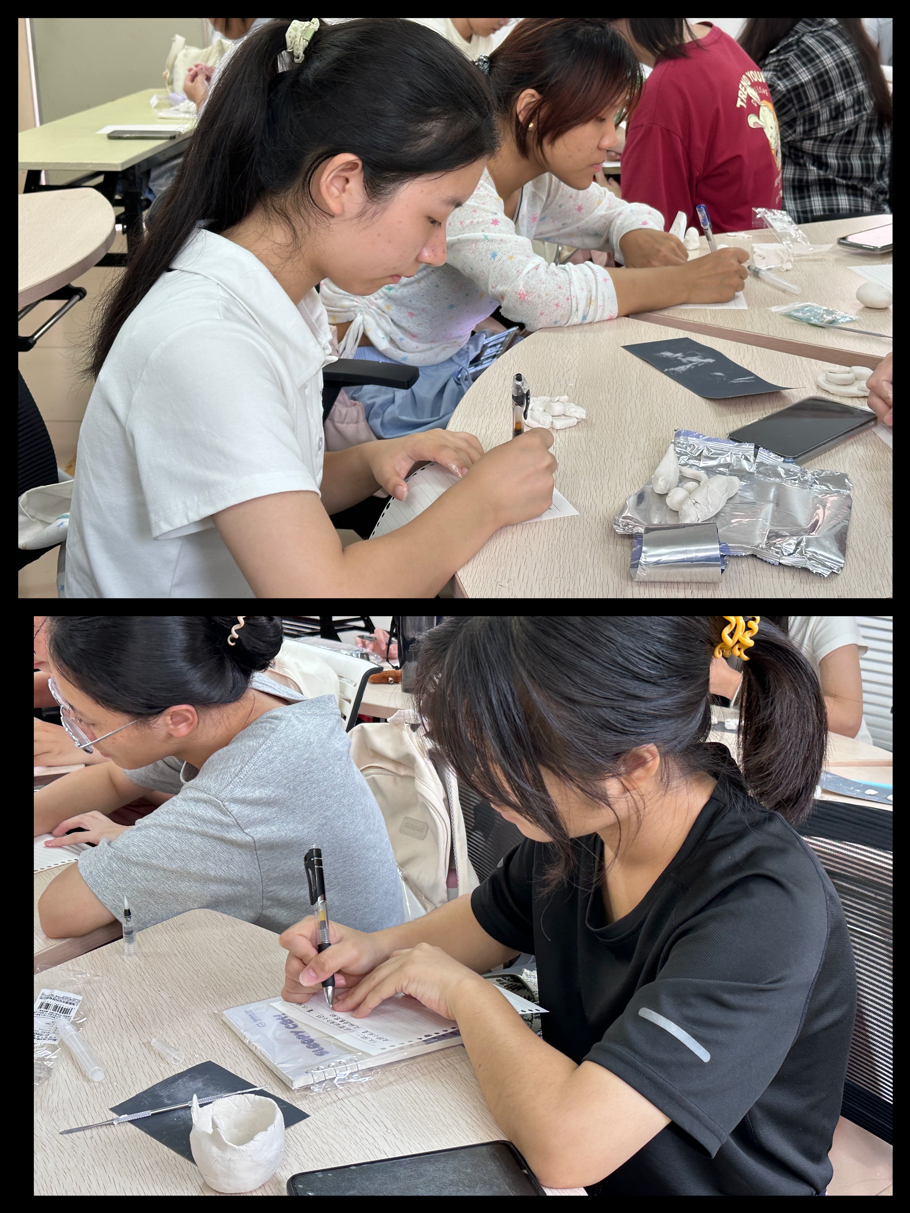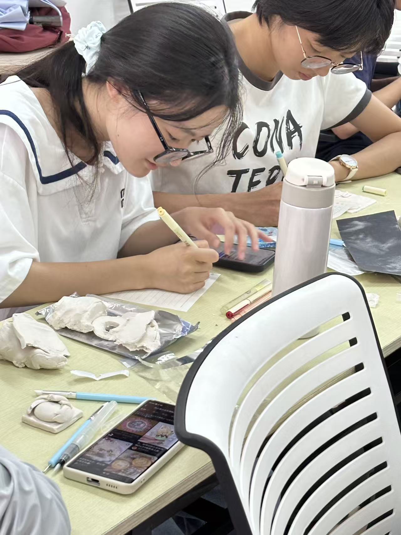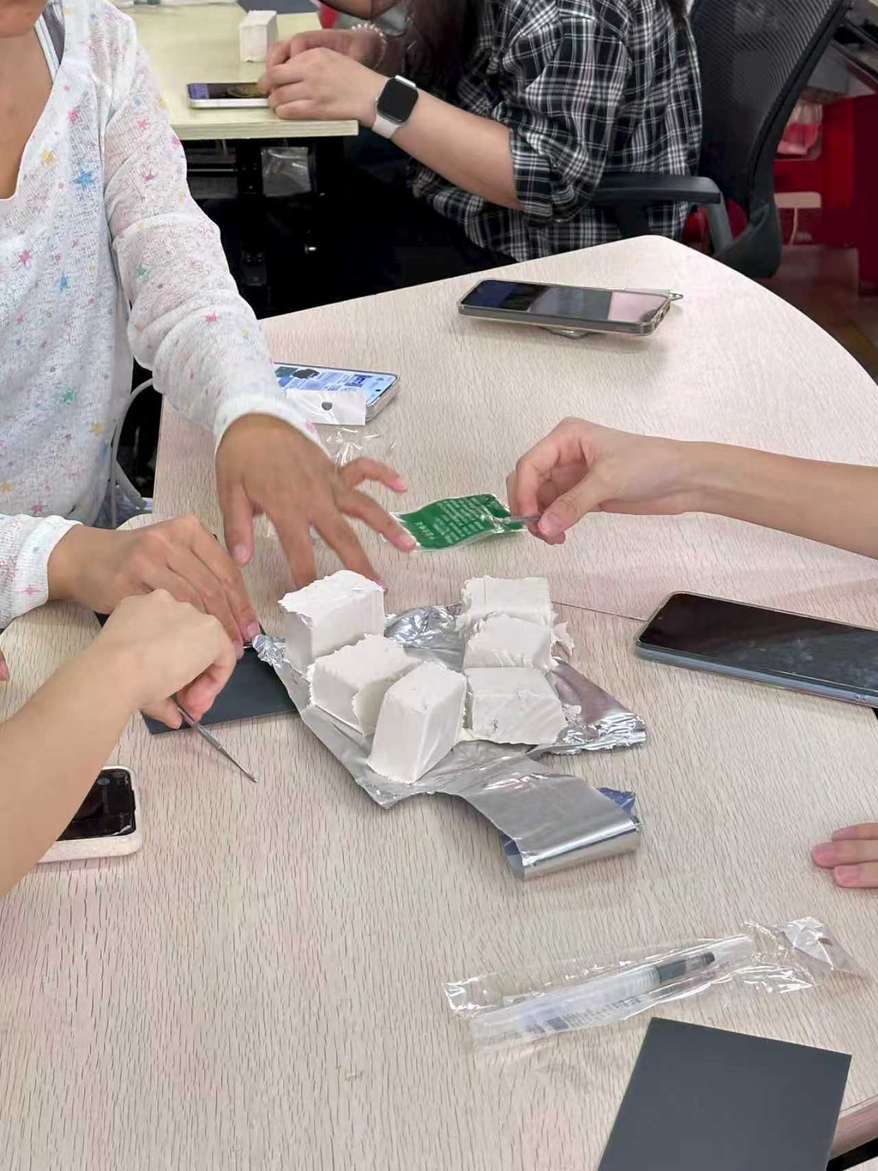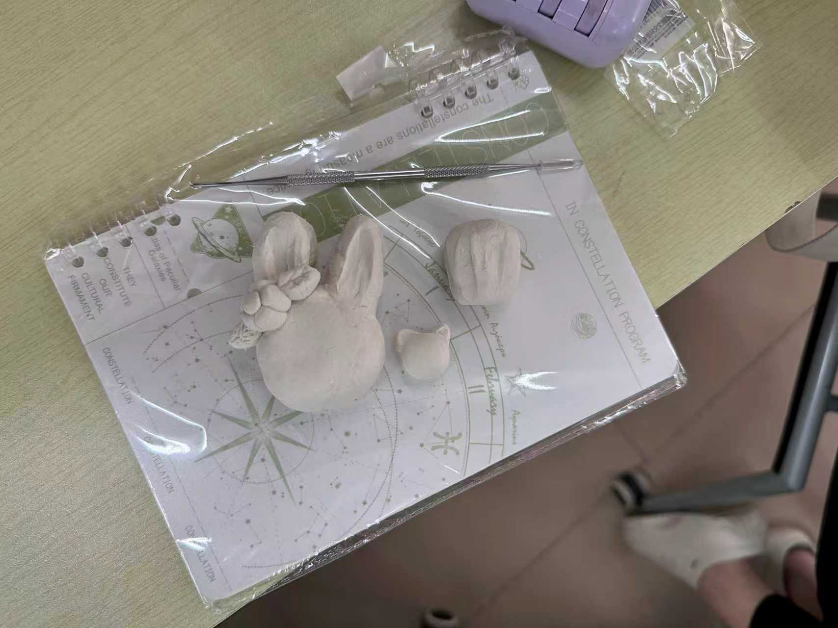 随着工作人员完成陶艺工具与石塑粘土的分发,同学们便开始搜索教程,拿起陶土揉捏试探。从生疏地将陶土揉成圆球,到熟练地用工具刻出纹路,大家在彼此的交流与摸索中,逐渐进入创作状态。一时间,活动室里满是专注与温情。