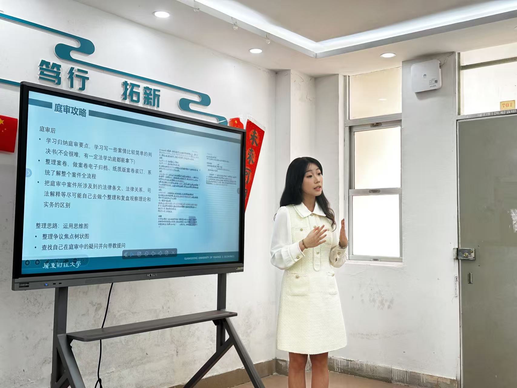 基于自身实践,她将实习过程拆解为“庭前—庭审—庭后”三个阶段,并为每个阶段提供了具体建议。她特别强调,预判分析、庭审观察与及时复盘是提升实习成效的关键方法,帮助同学们将旁观转化为深度参与。