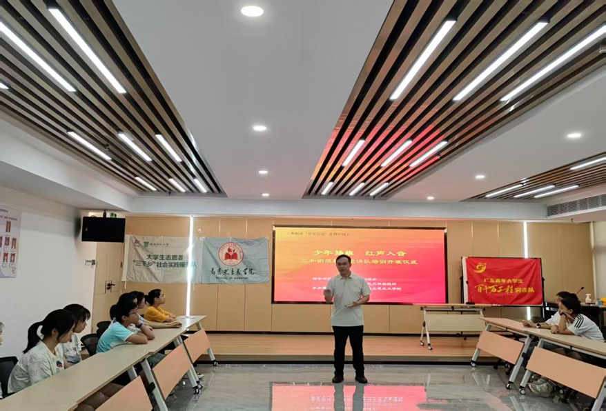 实践团成员林聪,围绕宣传惠州红色文化专题,讲解了滩头烈士与叶挺将军的不朽精神。实践团成员张刘洋,结合中国人民抗日战争暨世界反法西斯战争胜利80周年的时政热点,讲解了惠州抗战历史与精神传承,培训学员们如何结合时政热点宣传好惠州的抗战史,以及如何调动听众们用实际行动去传承革命精神。