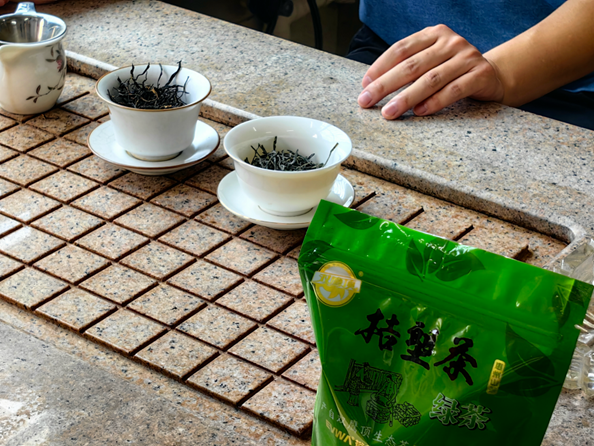 实践团首站前往惠州市金桔村双鹰顶生态茶园,在此品尝了桔塱茶中的红茶与绿茶。不同于普通茶叶的单一滋味,桔塱茶层次丰富:入口如涧泉清冽,划过喉咙时蜜香渐显,最终在舌尖留下厚重回甘,余韵在味蕾间久久萦绕。实践团成员捧着茶杯,看阳光透过茶汤在杯底投下细碎光斑,不禁感叹:“这是金桔村给予的馈赠。”