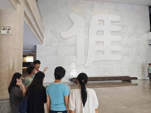 活动伊始,讲解员引导实践团成员们集中关注展厅墙上一个特殊的文字——客家方言中的“我”。从字形演变到文化寓意,讲解员娓娓道来,为实践团的成员们生动阐释了“我”这个字所承载的客家人身份认同与坚韧不拔的族群意识,队员们专注聆听,深受触动,从这单独的一个字中,感受客家文化强大的凝聚力,开启了“客映思政”视角下的文化探索之旅。