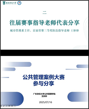 在往届赛事优秀指导老师分享环节,城市管理系主任王妙妙老师及土地及房地产管理系张鹏教授先后发言。王妙妙老师以“公共管理案例大赛参与分享”为主题,系统讲解了案例大赛的参赛意义、具体流程、撰写方式、评审标准等参赛细节,鼓励同学们走出课堂,用理论的思维和坚实的脚步丈量社会,让纸面的文字因脚下的泥土而芬芳;张鹏教授以回顾案例大赛国赛二等奖指导经历为切入点,强调同学们要“提高站位、瞄准定位、找准方位”,以国赛级别的高标准聚焦主题选取,不断打磨完善作品,争取为学院相关赛事再创佳绩。