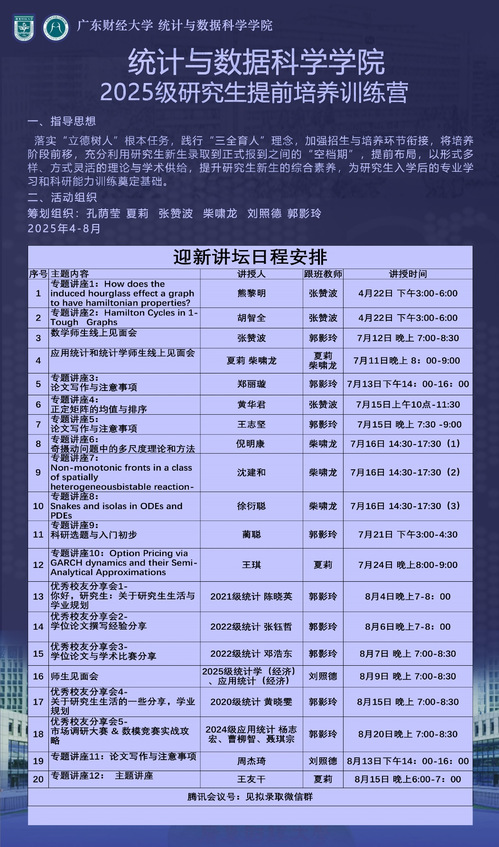 2025年暑期,统计与数据科学学院精心策划并成功举办了2025级研究生新生暑期训练营,通过将培养阶段前移,充分利用录取到正式报到之间的空档期,为新生提供丰富多样的理论与学术资源,全面提升其综合素养,为即将开始的研究生学习生涯奠定坚实基础。