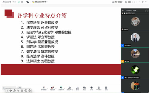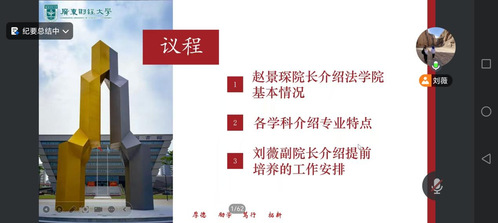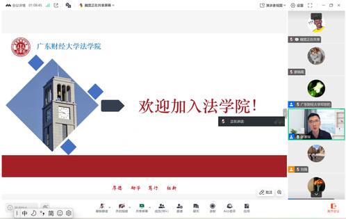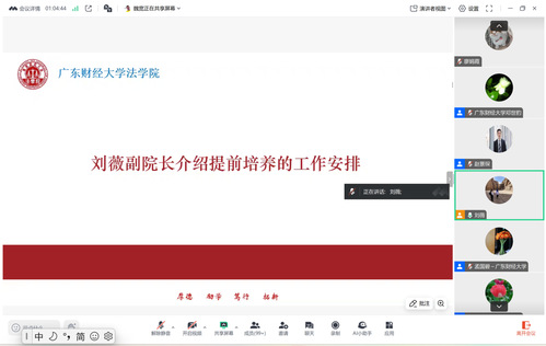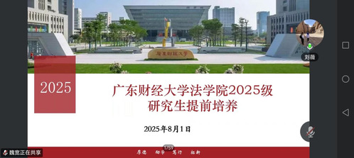 为帮助法学院2025级研究生新生更好了解学院情况、更快适应学习环境、明确学术研究方向与职业发展规划,2025年8月1日晚上,广东财经大学法学院于线上成功举行了“法学院2025级研究生提前培养”交流会。本次交流会由法学院副院长刘薇教授主持,法学院院长赵景琛教授,学科组长孙占利教授、邓世豹教授、邓立军教授、孟国碧教授、姚志伟教授、谢伟教授、蔡孟兼副教授以及研究生学科秘书老师何伟俊、辅导员老师刘高强、周星帆出席,2025级全体研究生新生参会。