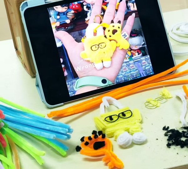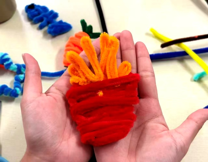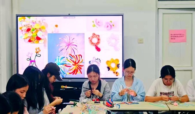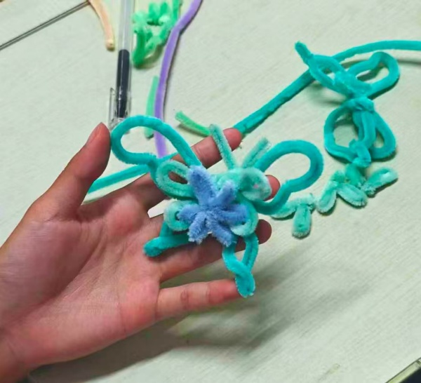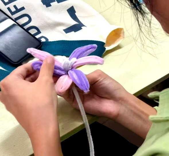 在轻松舒缓的音乐中,创作环节正式开启。桌前五彩缤纷的扭扭棒瞬间激起了同学们的创作灵感。大家纷纷动手,通过捻、绕、折、扭等手法,将脑海中抽象的情绪与感受,转化为一件件独具匠心的实体作品。