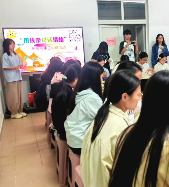 活动伊始,心理辅导站副站长王玟珂为同学们介绍了本次活动“将无形情绪化为有形作品”的创作理念,引导大家暂时放下焦虑烦恼,全身心投入指尖的创作,在与柔软扭扭棒的“对话”中安抚思绪,释放压力。创作过程中,心理辅导站站长张妮老师全程现场指导,针对同学们在扭扭棒塑形、色彩搭配等方面遇到的问题耐心解答,帮助大家将内心情绪更顺畅地转化为手中的作品,进一步提升了活动的体验感与解压效果。