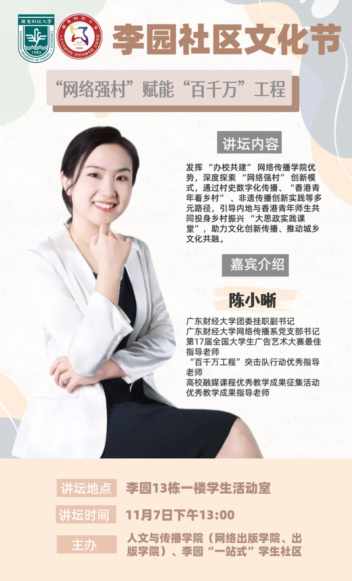 为引导广大青年以实践为笔,书写践行入党初心的青春篇章,发挥 “办校共建” 网络传播学院优势,深度探索 “网络强村” 创新模式,助力李园社区文化节的推广,本次特邀社会实践优秀指导老师陈小晰,她将通过村史数字化传播、“香港青年看乡村” 、非遗传播创新实践等多元路径,引导内地与香港青年师生共同投身乡村振兴 “大思政实践课堂”,助力文化创新传播、推动城乡文化共融。
