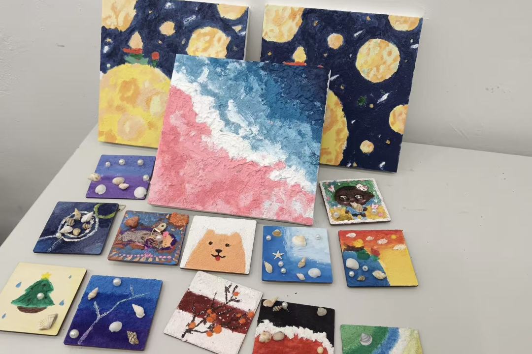 有人用蓝白砂砾堆砌出静谧的海浪与月光;有人以暖色调勾勒出温暖的向往……不同的纹理与色彩,诉说着各异的故事与情绪——有迷茫,有释然,也有对生活纯粹的热爱。