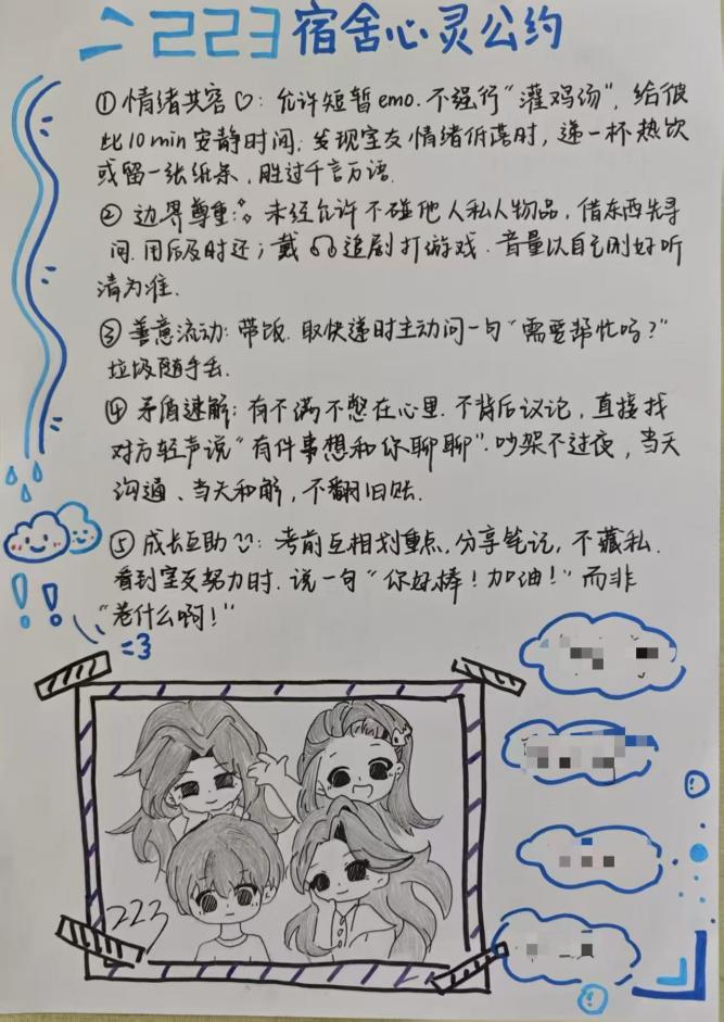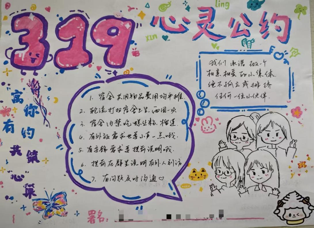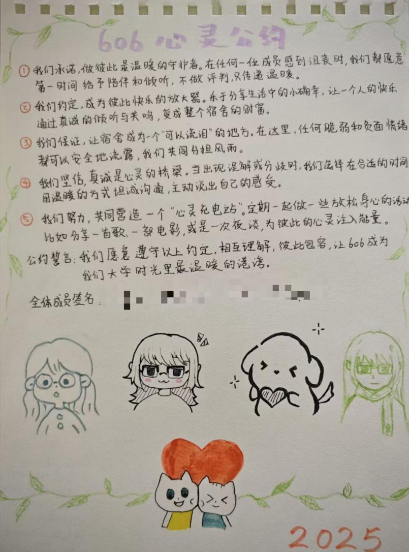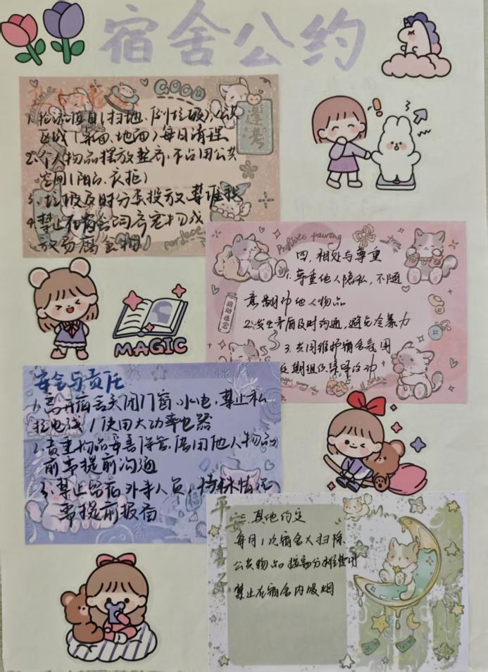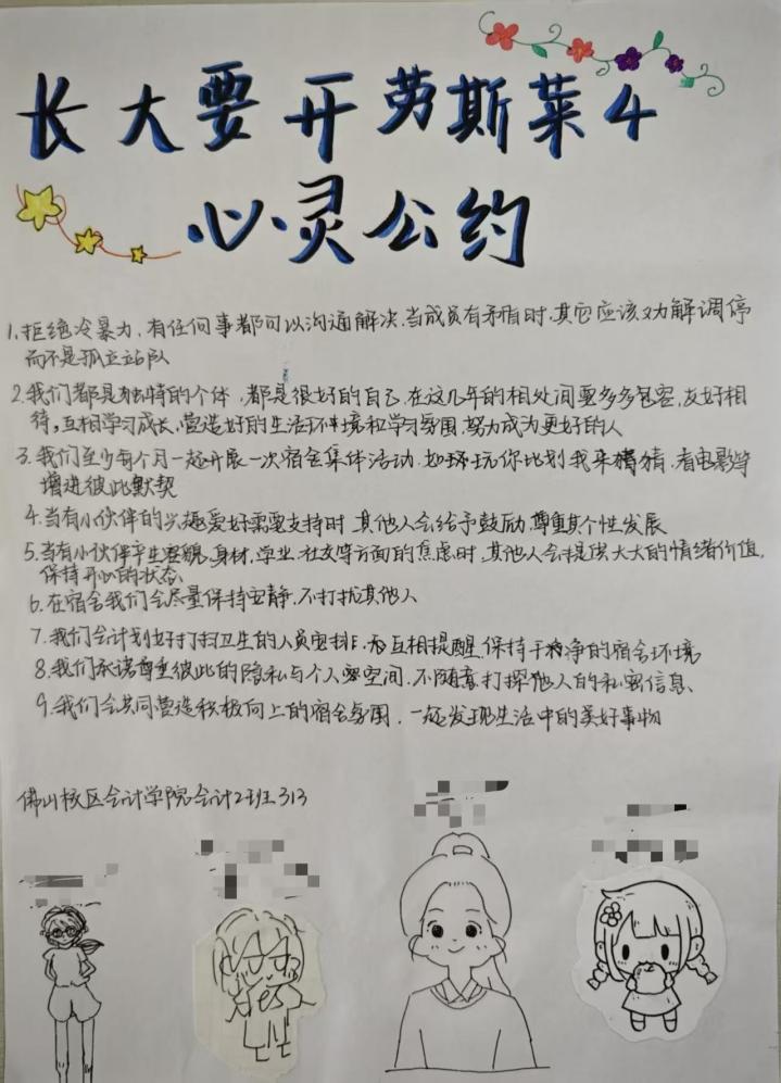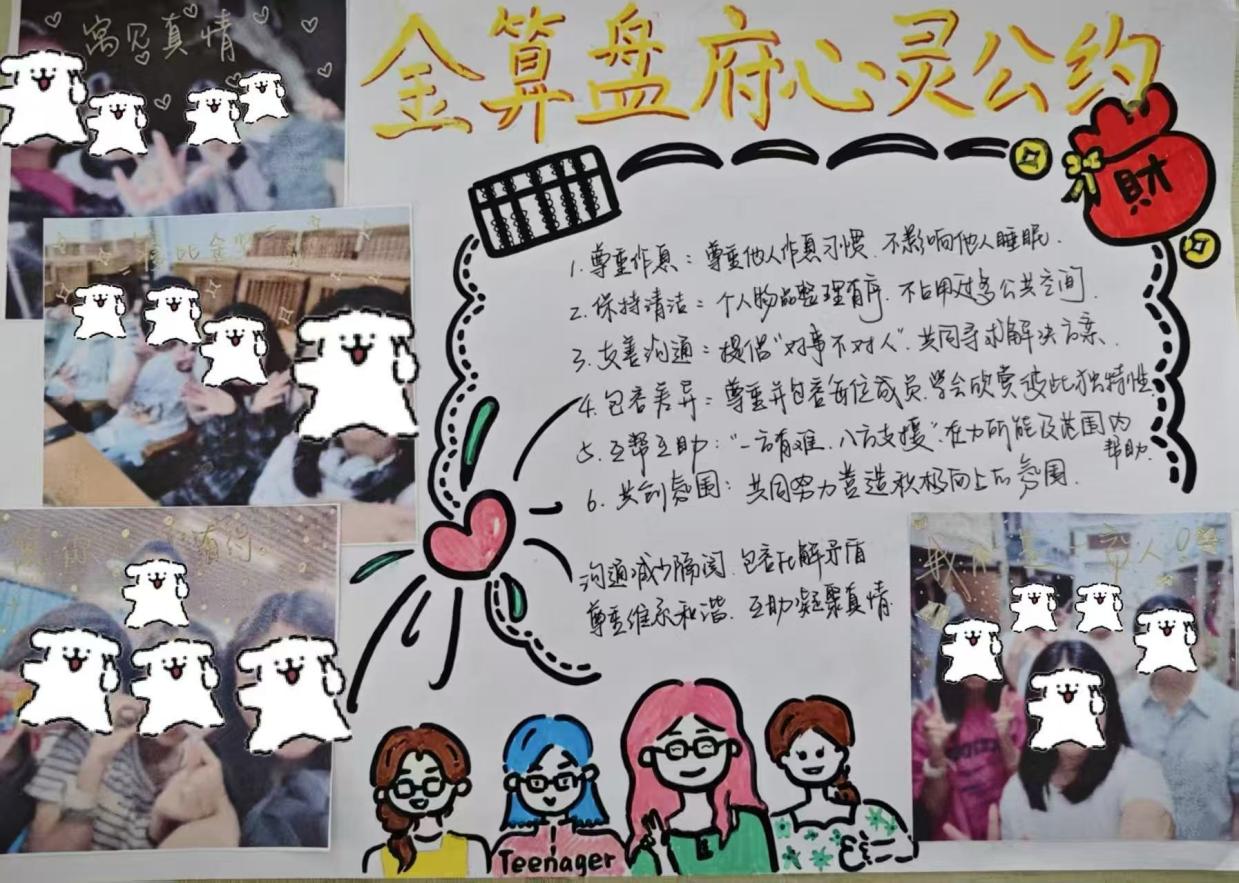 宿舍,是校园里的温馨港湾,是褪去疲惫、收获温暖的地方。为进一步丰富宣传和普及心理健康知识,培育大学生的积极心理品质,丰富校园文化生活,会计学院积极开展“润心工程”系列心理健康教育活动:宿舍心灵公约创作活动。经学院心理辅导站评审,优秀宿舍公约作品正式展出!这些公约,是舍友间的无声承诺,是日常相处的行为准则——从按时熄灯的作息约定到保持整洁的卫生习惯,从安静学习的氛围守护到互帮互助的情谊传递。每一幅作品都是青春的注脚,是室友间的真诚约定。让我们一起来欣赏各宿舍的特色“宿舍公约”吧!(展示顺序不分先后)