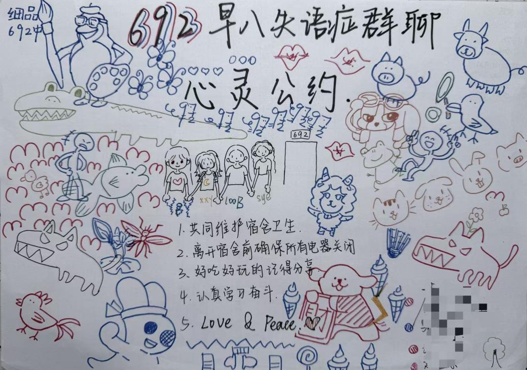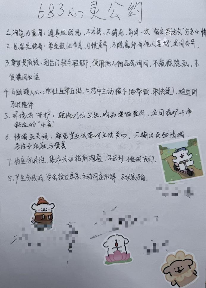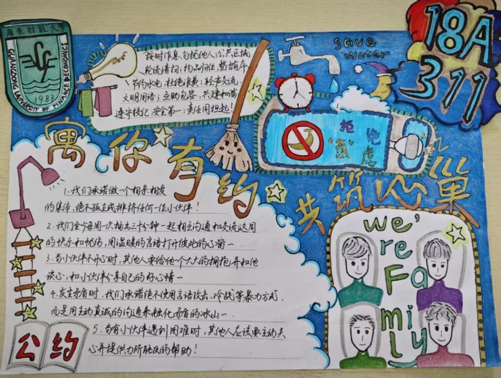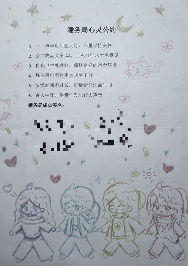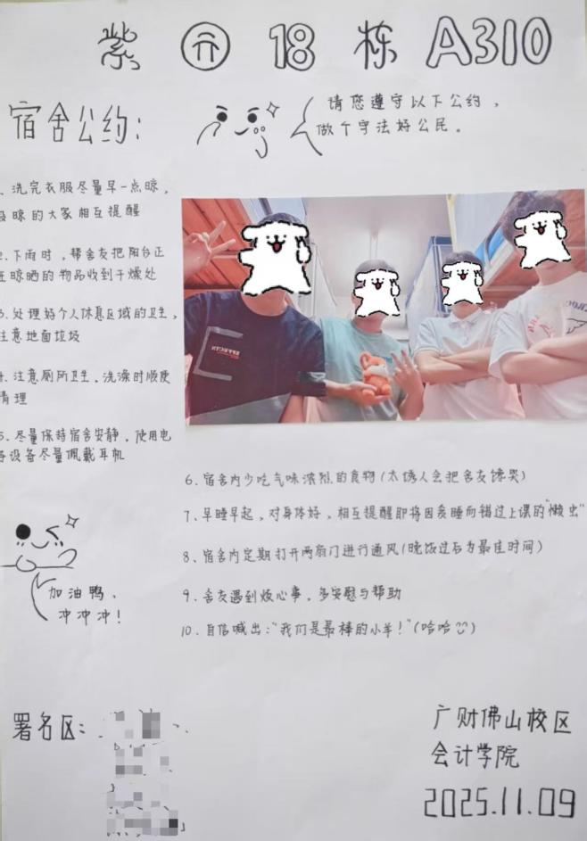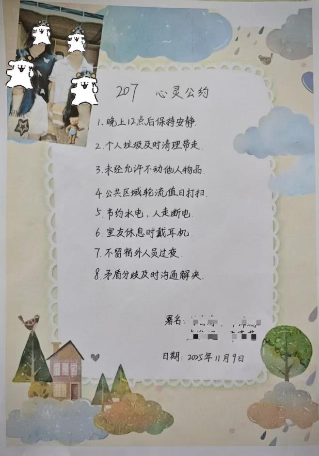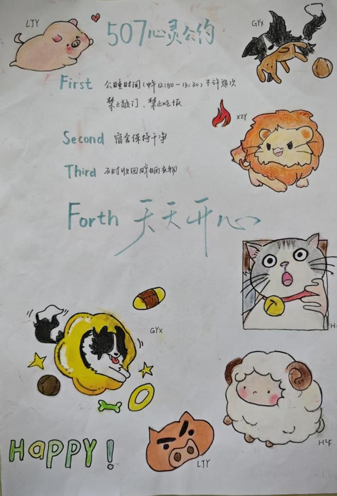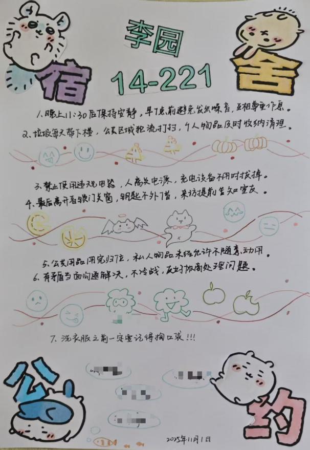 宿舍,是校园里的温馨港湾,是褪去疲惫、收获温暖的地方。为进一步丰富宣传和普及心理健康知识,培育大学生的积极心理品质,丰富校园文化生活,会计学院积极开展“润心工程”系列心理健康教育活动:宿舍心灵公约创作活动。经学院心理辅导站评审,优秀宿舍公约作品正式展出!这些公约,是舍友间的无声承诺,是日常相处的行为准则——从按时熄灯的作息约定到保持整洁的卫生习惯,从安静学习的氛围守护到互帮互助的情谊传递。每一幅作品都是青春的注脚,是室友间的真诚约定。让我们一起来欣赏各宿舍的特色“宿舍公约”吧!(展示顺序不分先后)