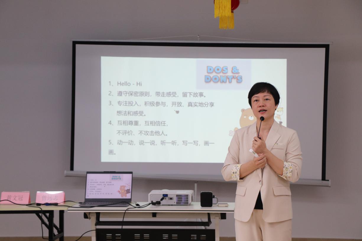 最后,曾老师带领全场进行“正念冥想”,在舒缓音乐中感受呼吸流转,学习注重当下。活动尾声,各小组用三张便笺写下收获、应用计划与疑问,并在分享中表示“收获了方法与开心”。老师们逐一答疑,为晚场活动圆满收尾。