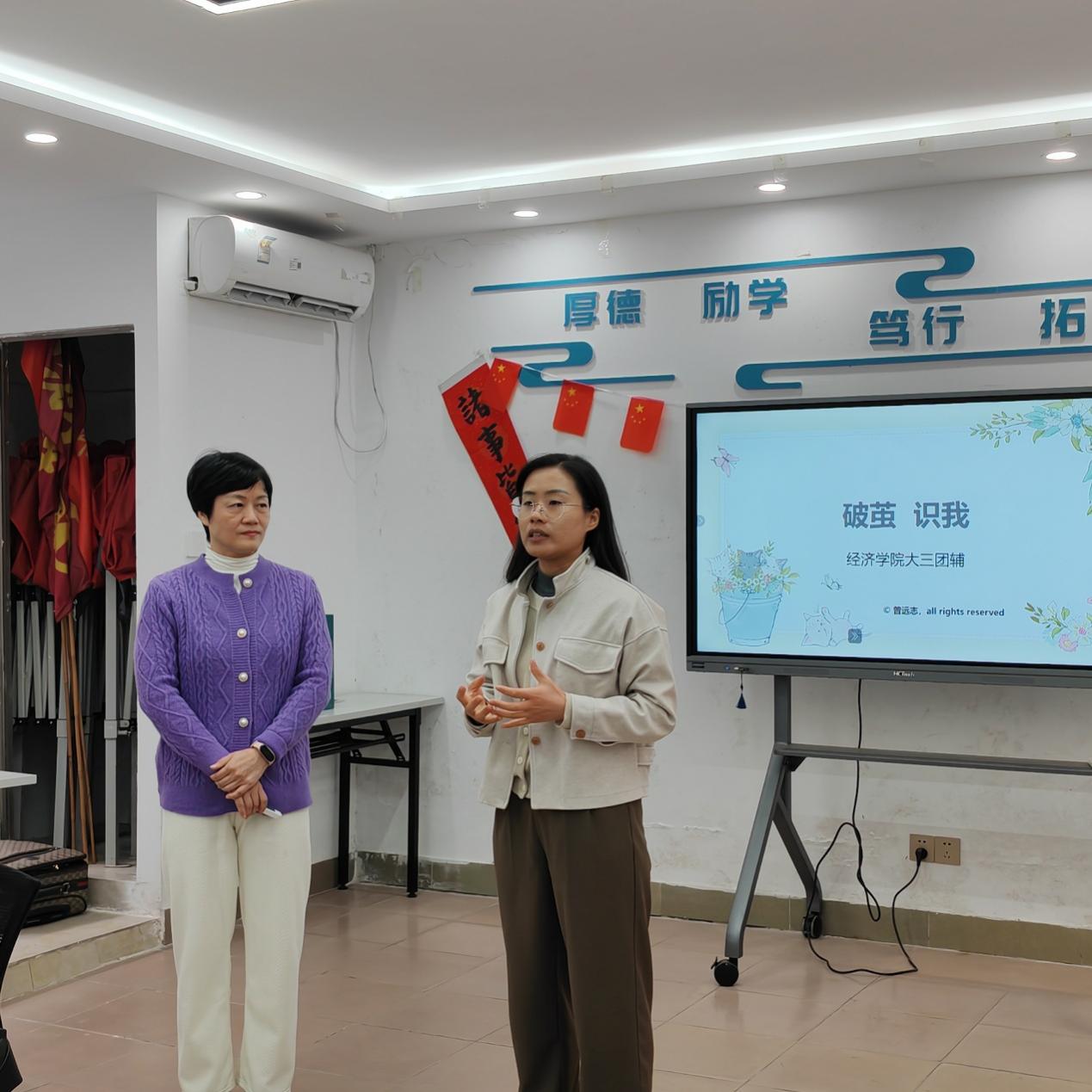 2025年11月18日,经济学院(广州校区)学生团体心理辅导活动在杜鹃苑105活动室顺利举办。本次活动由国家二级心理咨询师、1993级国贸专业校友曾远志携手心理咨询师黄文冠、曾碧梅共同领航。2022级数字经济(佛山校区全学段)、2023级各班和2024级、2025级国际商务(中外联合培养项目)班共计28位心理委员、班长参加了本次活动。2023级辅导员李珊老师开场发言,全程参与学习。一场以“破茧・识我”为主题的团体心理辅导活动温情启幕,学生骨干们在沉浸式互动中解锁自我认知的新维度,在心灵碰撞中凝聚成长力量。
