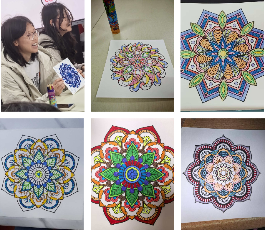 活动最后,同学们手持自己创作的曼陀罗画作合影留念,为此次心灵之旅画上了圆满的句号。一张张充满创意的作品与灿烂的笑容,定格成活动最生动的成果。