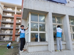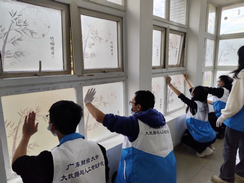 在完成基础清洁后,志愿者们在老师的指导下,将椅子搬到室外晒太阳灭菌,既保证了卫生安全,又体现了细心周到。同时,部分同学专注于清理地面的顽固污渍,不放过任何一个卫生死角。志愿者们相互配合,为窗户贴上了带有竹园特色的玻璃窗贴,窗贴透光不透明,让老师们的隐私有了保障,也让整个办公室散发出独特的文化气息。