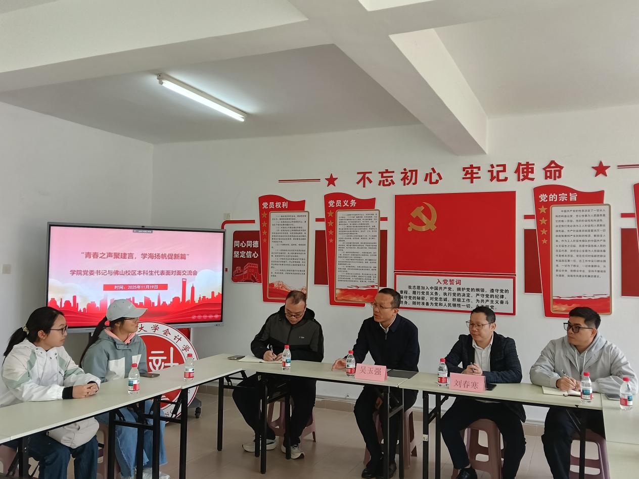 为倾听青春心声、汇聚成长建言,助力本科生在学海扬帆远航,推动学院教育教学高质量发展,会计学院于1119日在紫园“一站式”学生社区党团活动室召开党委书记与佛山校区本科生代表面对面交流会。会计学院党委书记吴玉强、副书记刘春寒,佛山校区辅导员曹炜、刘振泳及学生代表齐聚一堂,共话成长。