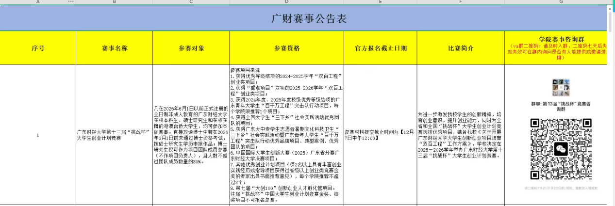 【赛事公告表】内会发布收集各类赛事信息(含报名时间、比赛简介、咨询群二维码等),方便各位同学随时查询。