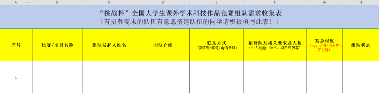 【赛事组队需求收集表】支持双向匹配:团队可发布招募需求(专业、技能、名额),个人可填写优势特长(专业背景、获奖经历、擅长领域),提供组队共享表格,收集有招募需求的团队以及有意愿搭建队伍参赛同学的信息,方便有组队需求的同学互相交流,畅通信息渠道。