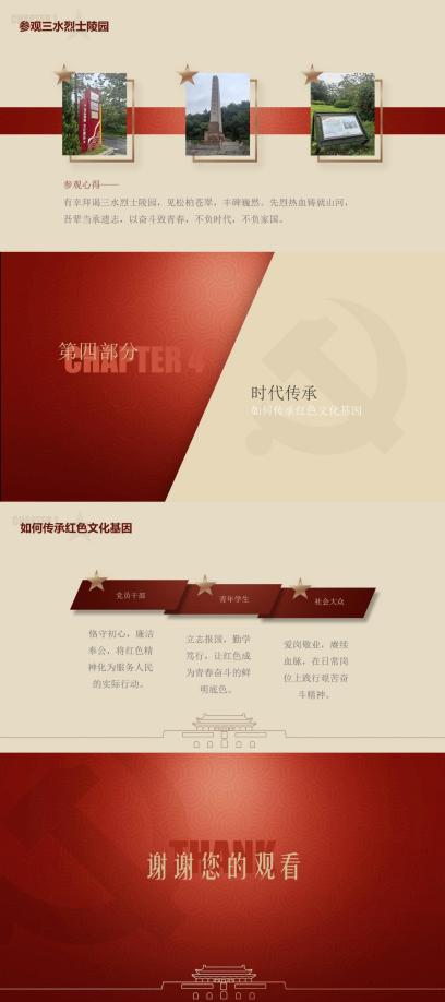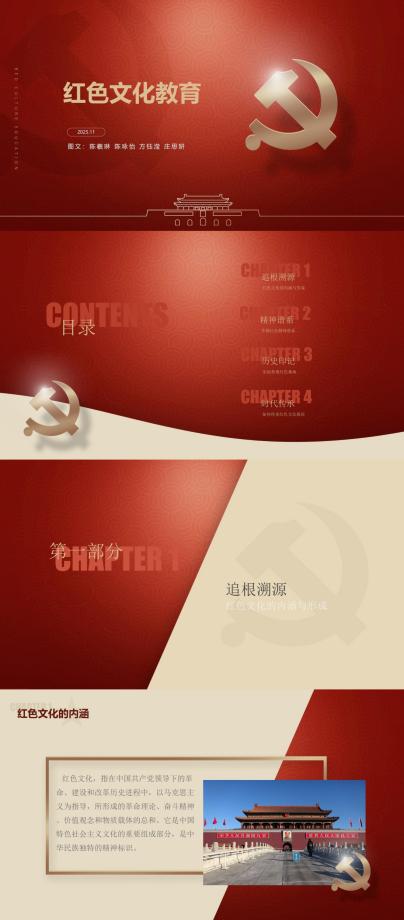 作品简介:团队成员以PPT形式围绕红色文化教育主题,用“追根溯源”、“精神谱系”、“历史印记”、“时代传承”四个部分,系统地呈现了红色文化的来源、内涵以及精神基因。通过“红色文化是什么”-“为什么传承红色文化”-“我们怎么做”的步骤,展现了对红色精神传承的信心和决心,呼吁广大青年赓续红色基因。