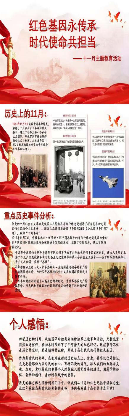 作品简介:作者以ppt的形式汇报了“聚力网络强村,赋能百千万工程”的学习成果,从“百千万工程”的实践活动中体悟科技赋能给人民生活带来的深刻变化。让大学生走进乡村,将“网络强村”落到振兴发展的实处。除此之外,作者以十一月为线索点,连接历史上各个重大事件,体现了“红色基因永传承”的主题,明确“时代使命共担当”的任务。通过细致的分析和个人感悟展现了作者内心涌动的爱国热忱。