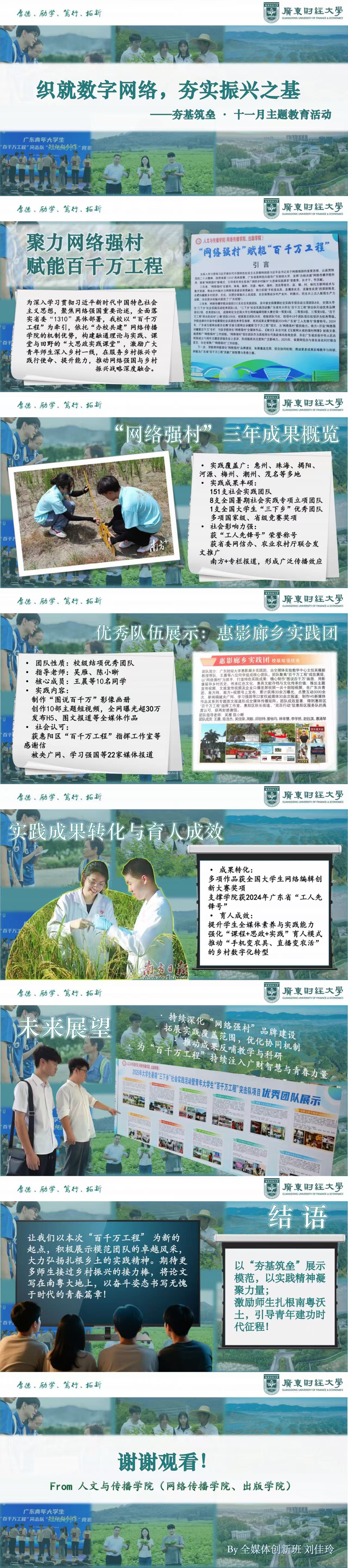 作品简介:作者通过学习“朝韵传家”三下乡小组的暑期实践成果,以访谈推文的形式展现了此次活动的价值所在,展现了广财青年扎根实践,深入基层的实干精神。作品分为不同的模块,全方位展示了“朝韵传家”小队在实践过程中昂扬向上的精神风貌。