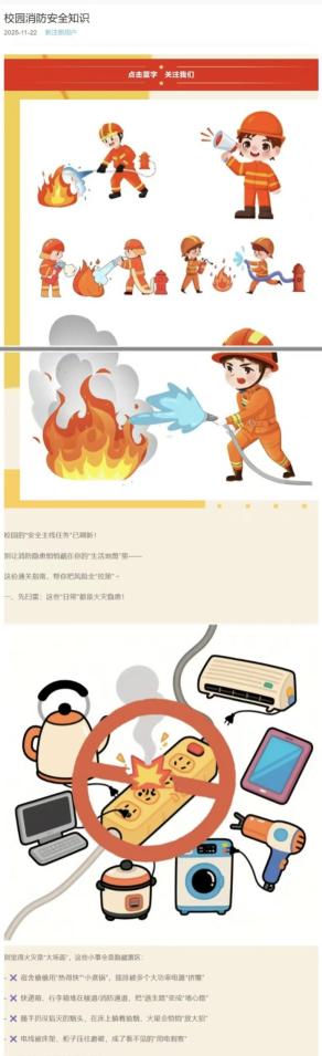 作品简介:小组以公众号推文的形式,围绕校园常见的消防风险展开讨论,明确了宿舍违规用电、楼道堆物、逃生技能不足等核心宣传点,明确了校园消防安全宣传的核心内容与传播风格,整理出贴合学生生活的消防知识清单,解决了“宣传内容怎么让同学愿意看、记得住”的问题。后续这些内容会通过校园宣传渠道触达更多师生,帮助大家识别身边的消防隐患、掌握实用安全技能。同时小组也梳理出了主题宣传的高效推进思路,提升了成员的内容策划能力。