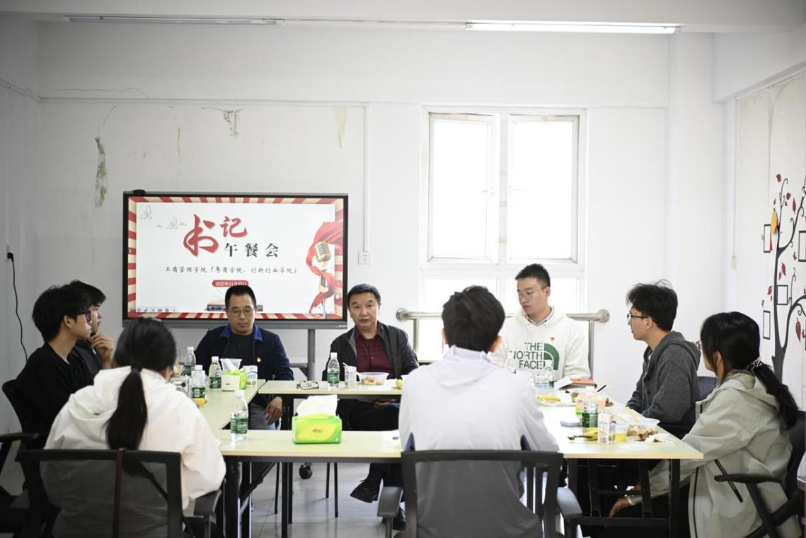 2025年11月25日中午,工商管理学院(粤商学院、创新创业学院)分别于28栋学生社区和立德楼432会议室成功举办书记午餐座谈会与“共话未来”院长午餐会。学院党委书记王德斌、院长马宗国教授分别带队,与各年级学生代表共进午餐,围绕学业发展、职业规划、综合素质提升和就业创业等话题展开深入交流,现场气氛温馨融洽。