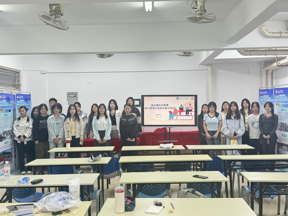 为给备战英语四六级考试的同学提供实用备考策略与高分经验,帮助同学们在冲刺阶段找准方向、提升应试能力,11月25日,金融学院在李园一站式社区党团活动室成功举办四六级高分经验分享会。本次活动特邀六级536分的李俊良、四级590分的卢欣婷和四级585分的陈燕华三位高分同学担任分享嘉宾,吸引30余名同学积极参与,学院辅导员老师黄宙、肖淇滨出席活动。