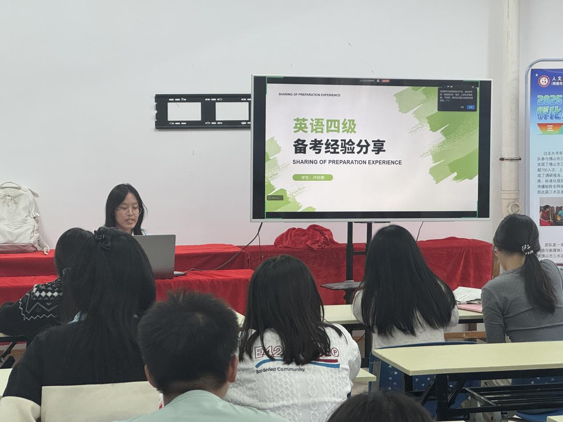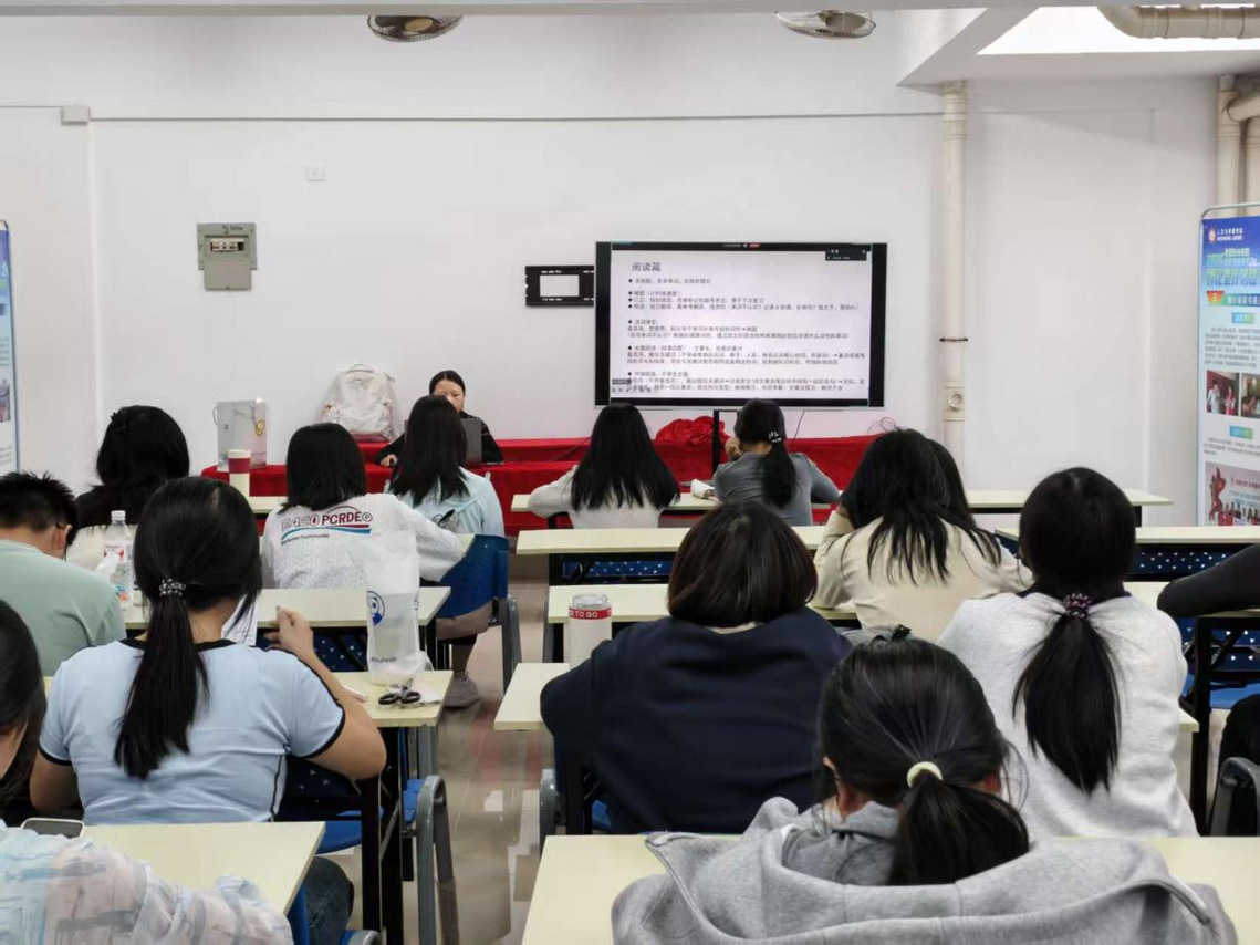 分享会上,三位学霸结合自身备考经历,分别从不同角度系统梳理了高效复习路径。李俊良同学围绕六级考试的整体备考规划、真题训练方法及考场应对策略展开讲解,重点分享了常见题型的解题技巧、科学的时间安排策略以及考前心态调整方法,为同学们提供了可操作的实战指导。卢欣婷同学则以单词记忆为切入点,介绍了多种高效背词方法,并结合真题案例逐步演示答题思路,总结出具有普遍适用性的解题规律,内容清晰具体、易于掌握。陈燕华同学同样强调了词汇积累在英语学习中的关键作用,并对四六级各题型特点进行了深入剖析,有针对性地提出备考建议与冲刺方向,帮助同学们进一步明确复习重点。