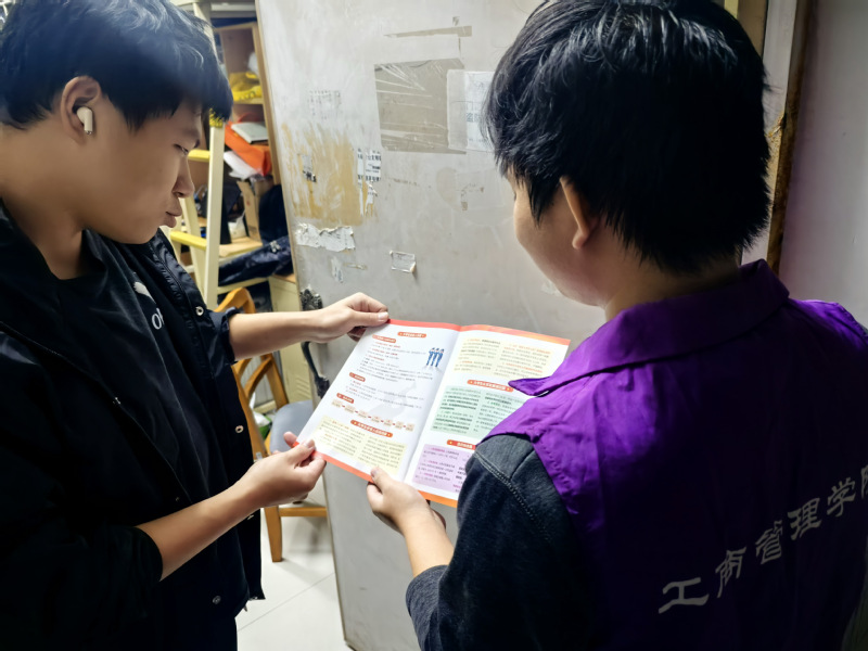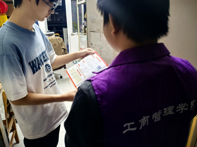 活动中,身着“工商管理学院”色马甲的志愿者团队深入学生宿舍,开展个性化政策宣讲。志愿者们携带印有“守山河 护家园”字样的红色宣传册,围绕入伍条件、学业保障、就业优惠等学生重点关注的问题,进行细致解读与答疑。相较于传统讲座形式,“入户式”宣讲更显灵活亲切,志愿者与学生近距离互动,针对性回应学业衔接、报名流程等个性化疑问,让政策解读更接地气、更易理解。参与学生纷纷表示,宿舍内的交流氛围轻松,疑问能得到及时细致的解答,对征兵政策有了更全面的认识。