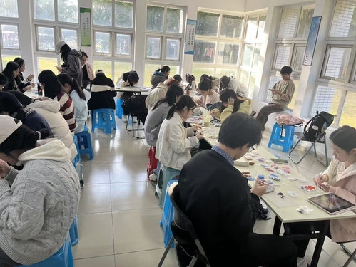 活动中,同学们全神贯注,化身“能工巧匠”,手持小镊子,小心翼翼地将一颗颗微小的豆粒按照心中的图案在模板上精心拼凑。有的同学选择了可爱的卡通形象,有的则构思了精美的几何图案,还有的将校徽、易班熊等元素融入创作。期间,同学们不时相互交流构思、分享技巧,现场充满了专注的氛围与欢声笑语。