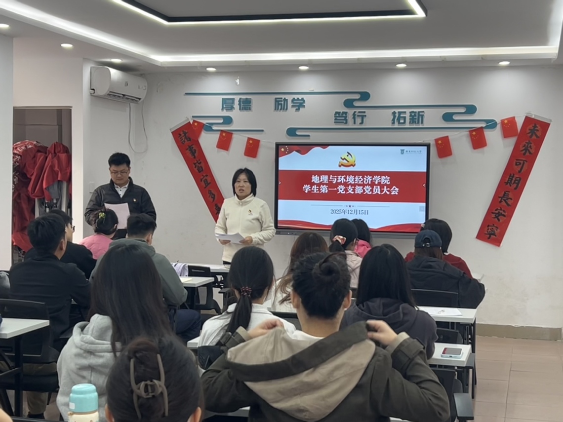 为深入学习宣传贯彻党的二十届四中全会精神,推动党的创新理论走进基层、走进学生,12月15日,地理与环境经济学院党委副书记甘乐乐在学生一站式社区杜鹃苑开展党的二十届四中全会精神专题宣讲,会议由学生第一党支部书记邓绍军主持。