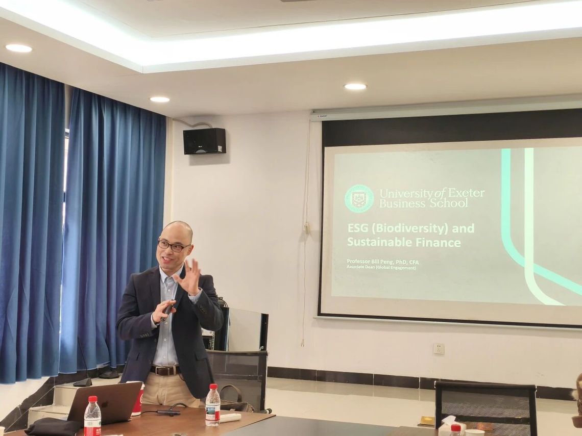 2025年12月16日下午,埃克塞特大学商学院副院长Bill Peng教授应邀来访我院,作为“有为讲堂”第十二期主讲嘉宾,围绕“ESG and Sustainable Finance”开展专题讲座与学术交流。我院副院长黄文锋、副院长罗任飞、国际化业务及2+2项目中心主任陈美兰、金融财管系系主任吴尚燃、办公室主任肖华娟、国际商务系教师田野,以及2025级财务管理专业(中外联合培养项目)学生共同参与本次活动。