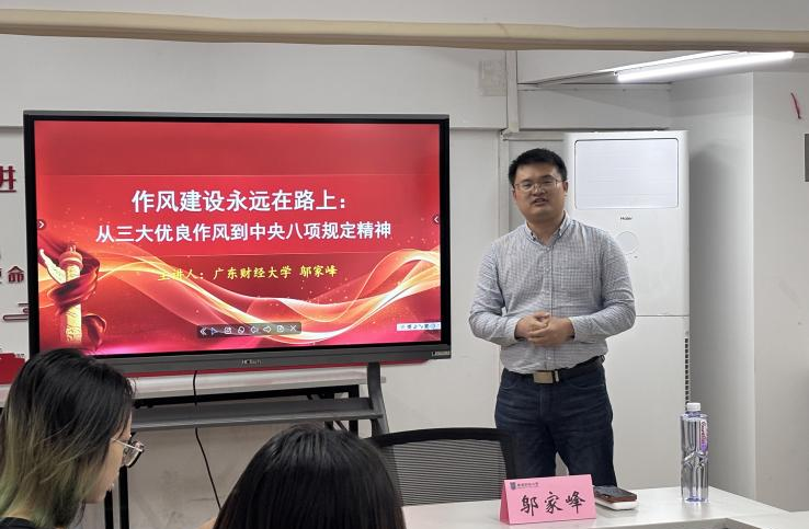 为引导青年学子深刻理解党的作风建设内涵、强化党性修养,12月18日,艺术与设计学院在棕榈苑“一站式”学生社区党团活动室举办作风建设专题讲座。学院党委副书记陈小璇、辅导员陈琪出席本次讲座,棕榈苑“一站式”社区代表参加,特邀马克思主义学院思政课讲师邬家峰博士开展“作风建设永远在路上:从党的优良作风到中央八项规定”专题讲座。本次讲座由陈小璇主持。