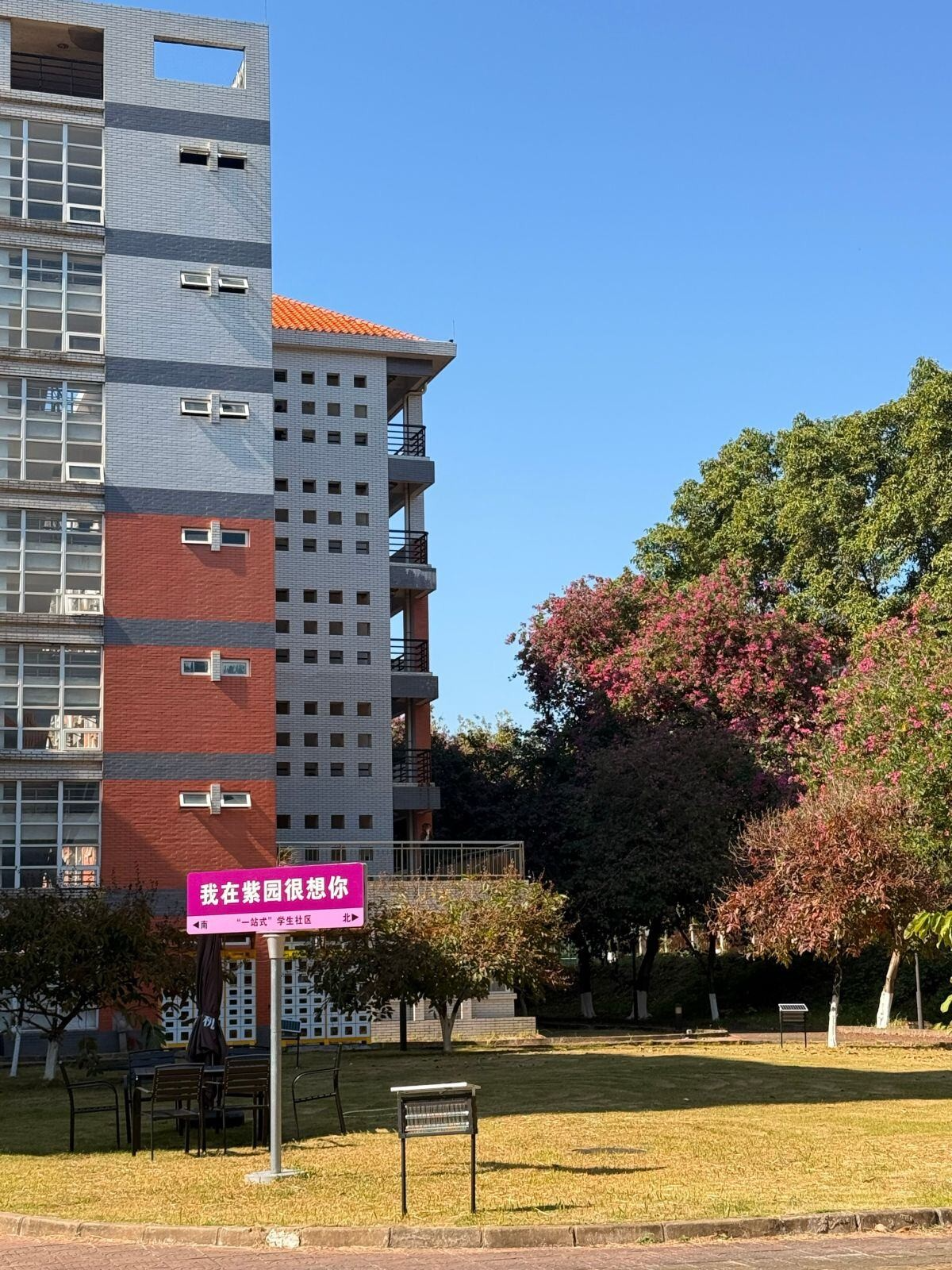 画面展现紫园社区的校园景致,现代建筑撞色设计醒目,粉牌写着“我在紫园很想你”,绿植繁茂,蓝天映衬下氛围清新又温馨。