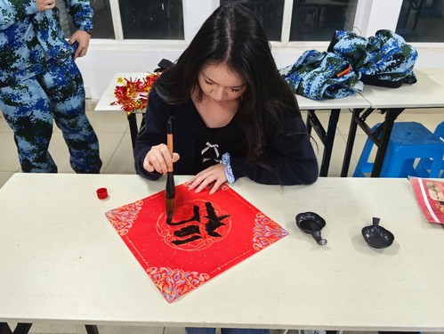 活动正式启动后,首个“写对联”特色环节温馨开启,为跨年夜奠定了浓厚的文化基调。工作人员提前备好笔墨纸砚,同学们踊跃参与,或凝神构思佳句,或挥毫泼墨书写,将对新年的美好期许融入笔端。一幅幅笔法稚嫩却饱含诚意的对联新鲜出炉,有的张贴在活动现场点缀氛围,有的被同学们精心收好留作纪念。