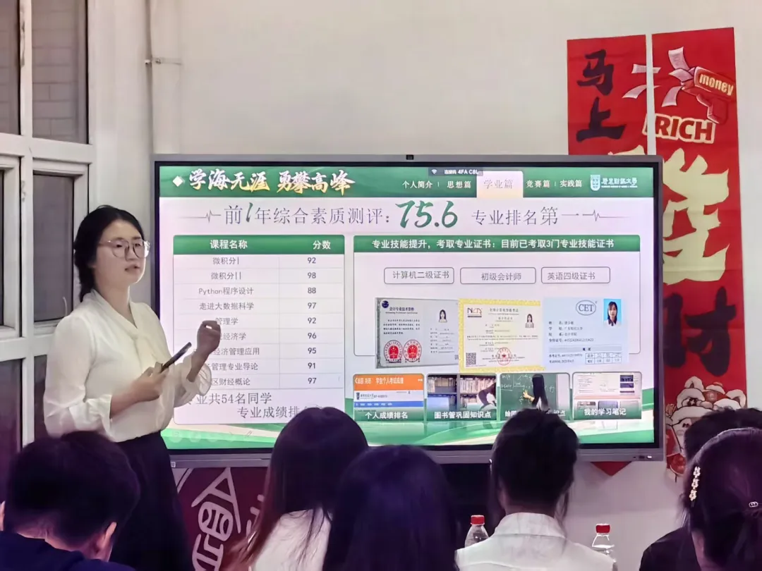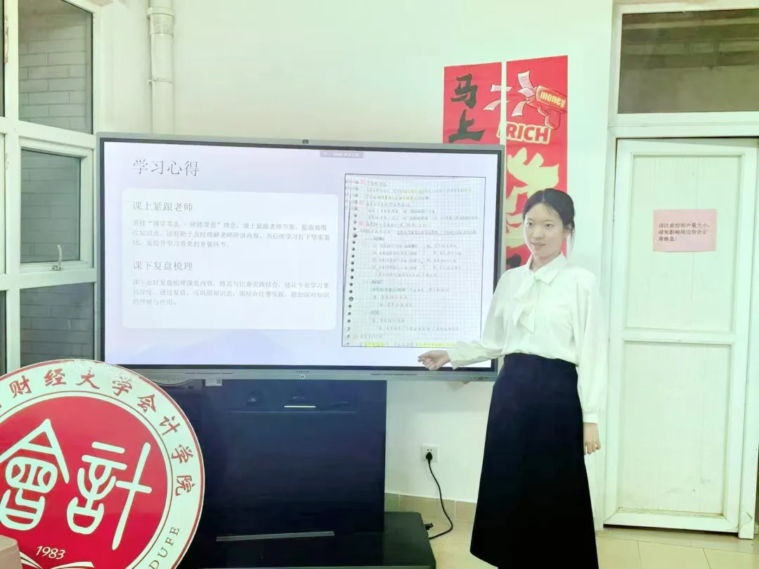 来自会计学院的李其洋、唐少敏,财政税务学院的许欢,工商管理学院的崔燕萍四位优秀学子分别从“学业、竞赛、实践协同成长” 展开分享。在学业方面分享了各自学科高效的学习方法;在竞赛方面,从选题、组队、分工以及比赛经历进行了细致的分享;在社会实践方面,他们积极投身百千万工程、社会志愿服务。榜样们鼓励同学们:以“先行动、再沉淀、后突破”的成长逻辑,勇敢迈出第一步,不必怕迷茫,行动起来就会有答案。