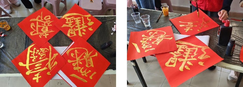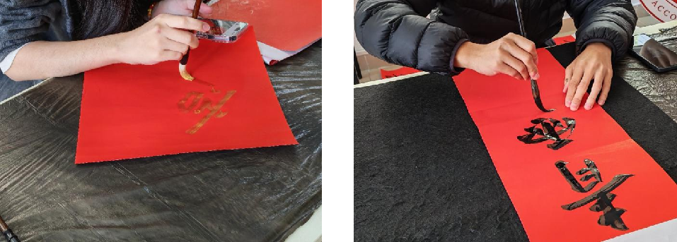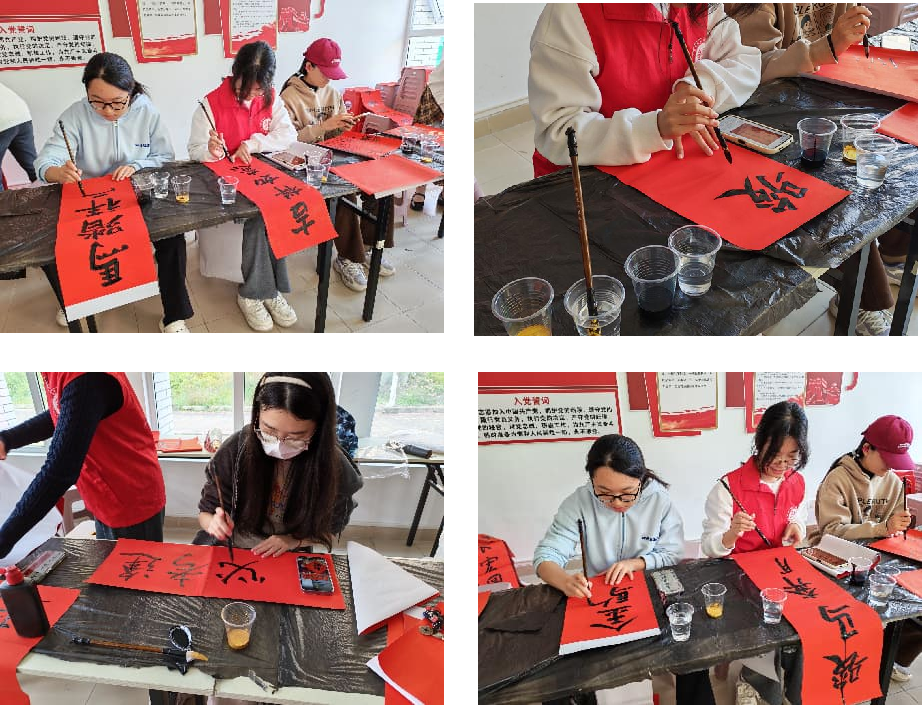 同学们在指导下铺展红纸,执笔蘸墨,凝神聚气,挥毫书写对新年的美好憧憬。一副副笔力遒劲、寓意吉祥的春联和“福”字渐次呈现,传统书法的艺术魅力与新年祝福完美交融。