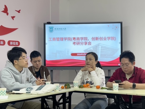 助力工商管理学院(粤商学院、创新创业学院)学子明确考研方向,理清考研思路,优化备考策略,提高考研人的应试能力。2026年3月5日下午2:00-4:00,工商管理学院考研经验分享会在广州校区28栋一站式社区党团活动室顺利开展。工商管理学院(粤商学院、创新创业学院)、28栋社区、笃行工作室联合主办本次活动,党委副书记何燕、辅导员李威威、赵瑞玲、郭宇睿与23级本科生、25级研究生齐聚一堂,共话考研,共赴理想