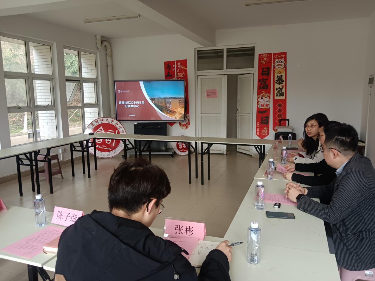为深入推进紫园“一站式”学生社区建设,凝聚多方育人力量,破解建设过程中的问题,3月11日下午15:00,紫园“一站式”学生社区2026年3月份联席会议在紫园“一站式”学生社区党团活动室(17栋B-112)召开。学生工作部副部长吴斯娜、会计学院党委副书记刘春寒、工商管理学院党委副书记何燕、财政税务学院党委副书记梁珊珊出席会议,社区固定工位、轮值工位辅导员及社区学生发展互助中心学生骨干代表参加会议。