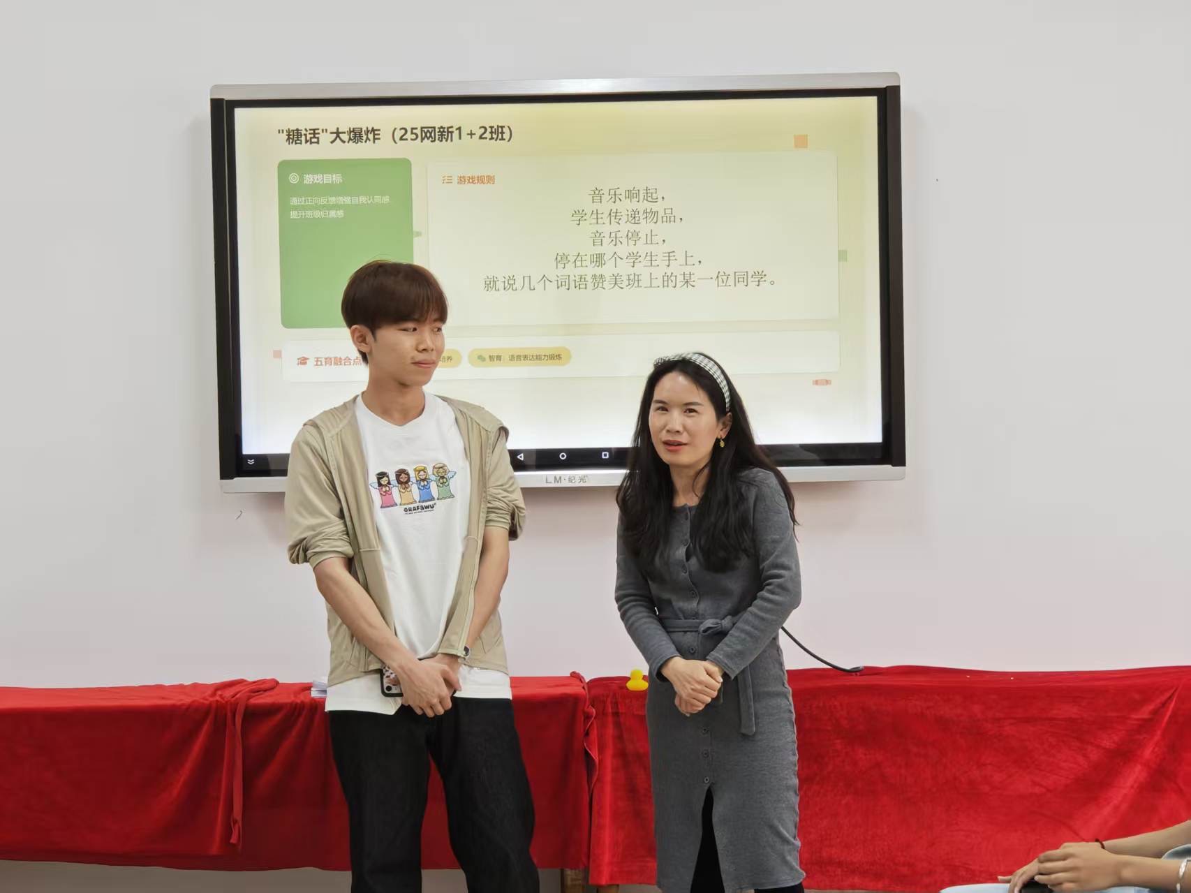 25网新1、2班的“糖话”大爆炸的德育游戏中,全班围绕着座位传递物品,音乐响起物品流转不停,音乐停止则由持物的同学担任“赞美使者”。被选中的同学大方开口,用“细心负责”“乐于助人”等真挚词语,夸赞身边同学的闪光点,句句赞美满含善意,现场掌声、喝彩声不断。