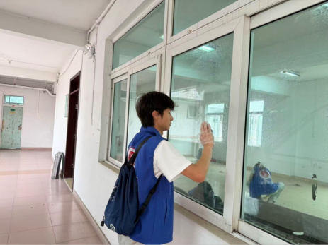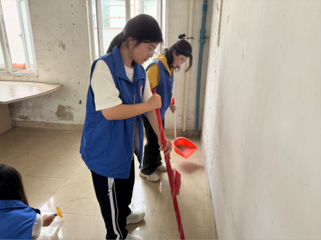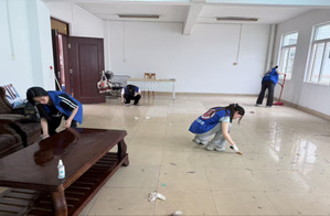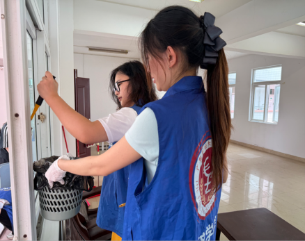 活动伊始,志愿者们身着统一蓝色志愿马甲,手持扫帚、拖把、抹布等工具,有序前往杏园二栋二楼办公室、三楼活动室等社区功能室。大家分工协作、干劲十足,对地面、门窗、桌椅、公共长椅等区域进行细致清扫。从走廊到活动室,每一处卫生死角都不放过,原本斑驳的地面在志愿者的努力下焕然一新,映出窗外的绿意,功能室环境更加明亮宜人。