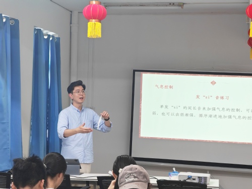 培训伊始,黄炜丹以“声音是表情达意的基础”为切入点,详细讲解了科学发声的方法。他从气息控制、共鸣控制等方面入手,带领学员进行现场练习,帮助大家掌握清晰、饱满、富有感染力的声音表达技巧。他强调,良好的声音状态不仅是表达的基础,更是建立自信与信任的关键。