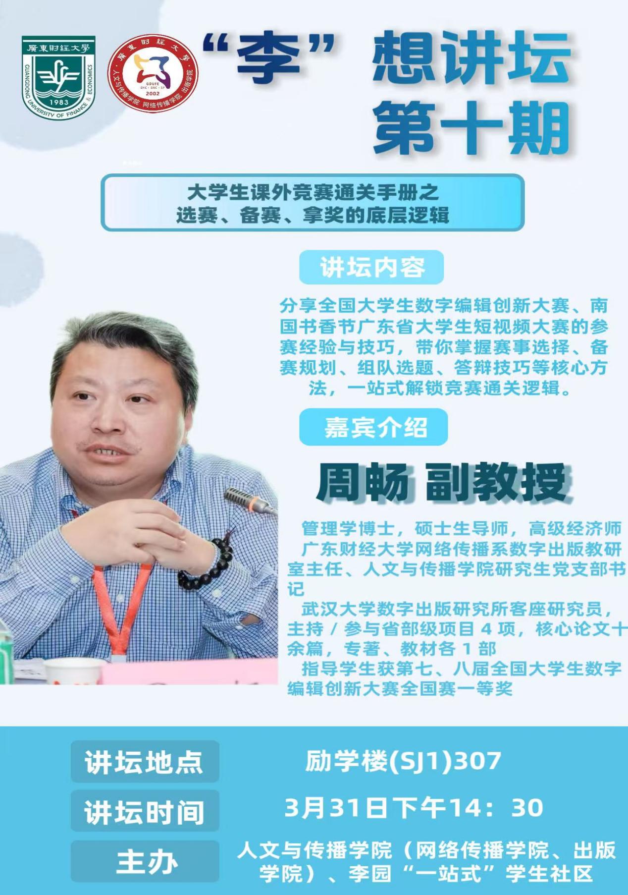 为帮助各位同学掌握课外竞赛通关逻辑,学院将举办“李”想讲坛第十期,本次讲坛特邀武汉大学数字出版研究所客座研究员兼广东财经大学网络与传播系数字出版教研室主任周畅副教授莅临开讲,聚焦大学生课外竞赛选赛、备赛、拿奖的底层逻辑,覆盖赛事选择、备赛规划、组队选题、答辩技巧等核心内容,一站式解锁竞赛通关秘籍,以期提高同学们参与课外竞赛的能力,提升自我,突破认知与能力的局限。