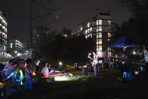 活动现场,Night Parade乐队依次演绎了《未闻花名》《夏日漱石》《孤稚》《海阔天空》等多首耳熟能详的热门曲目。乐队成员们凭借真挚的歌声与默契的配合,瞬间点燃全场气氛,悠扬的旋律在草坪上空回荡,吸引了众多同学驻足聆听,共享美好的音乐时光。