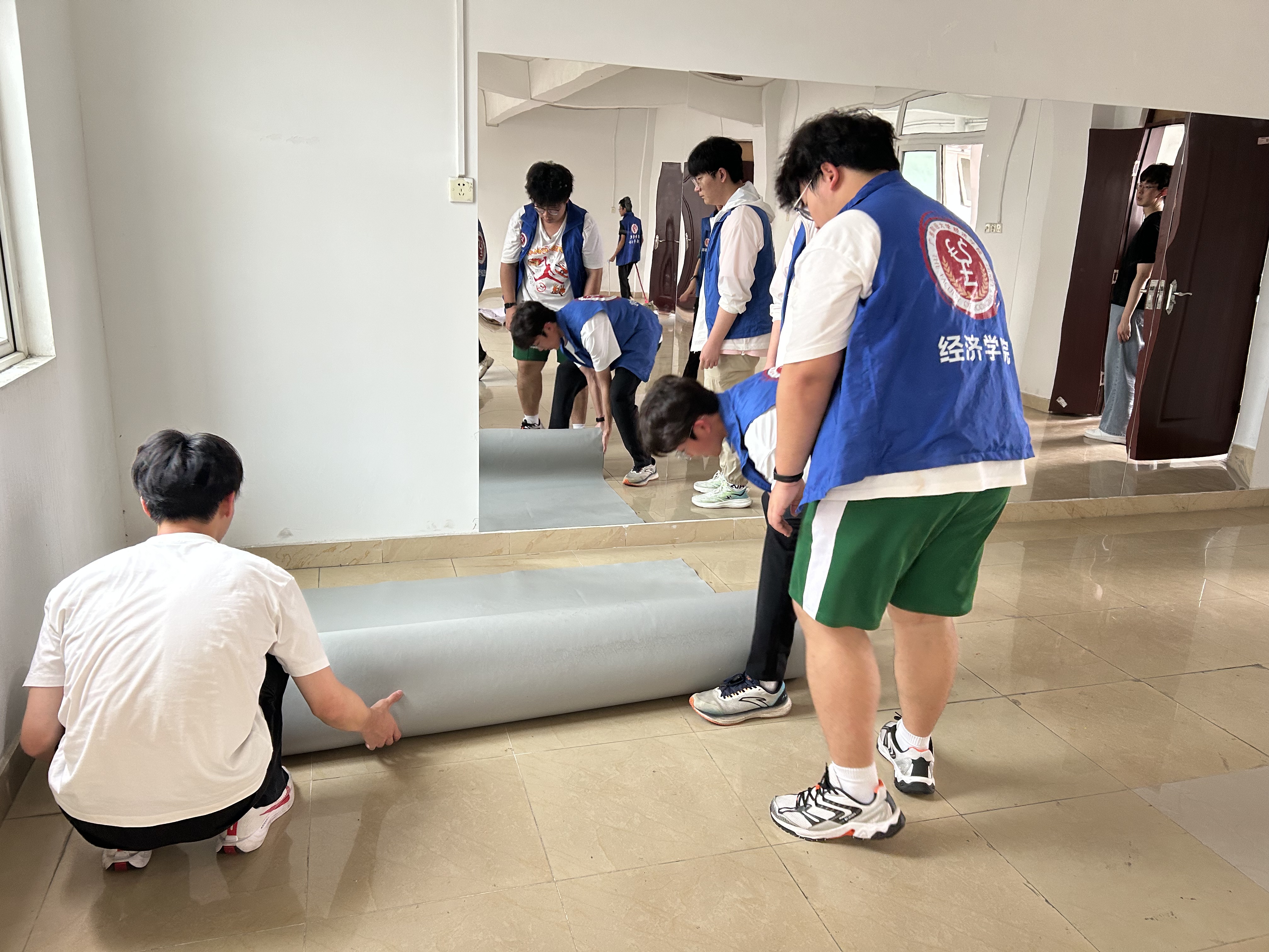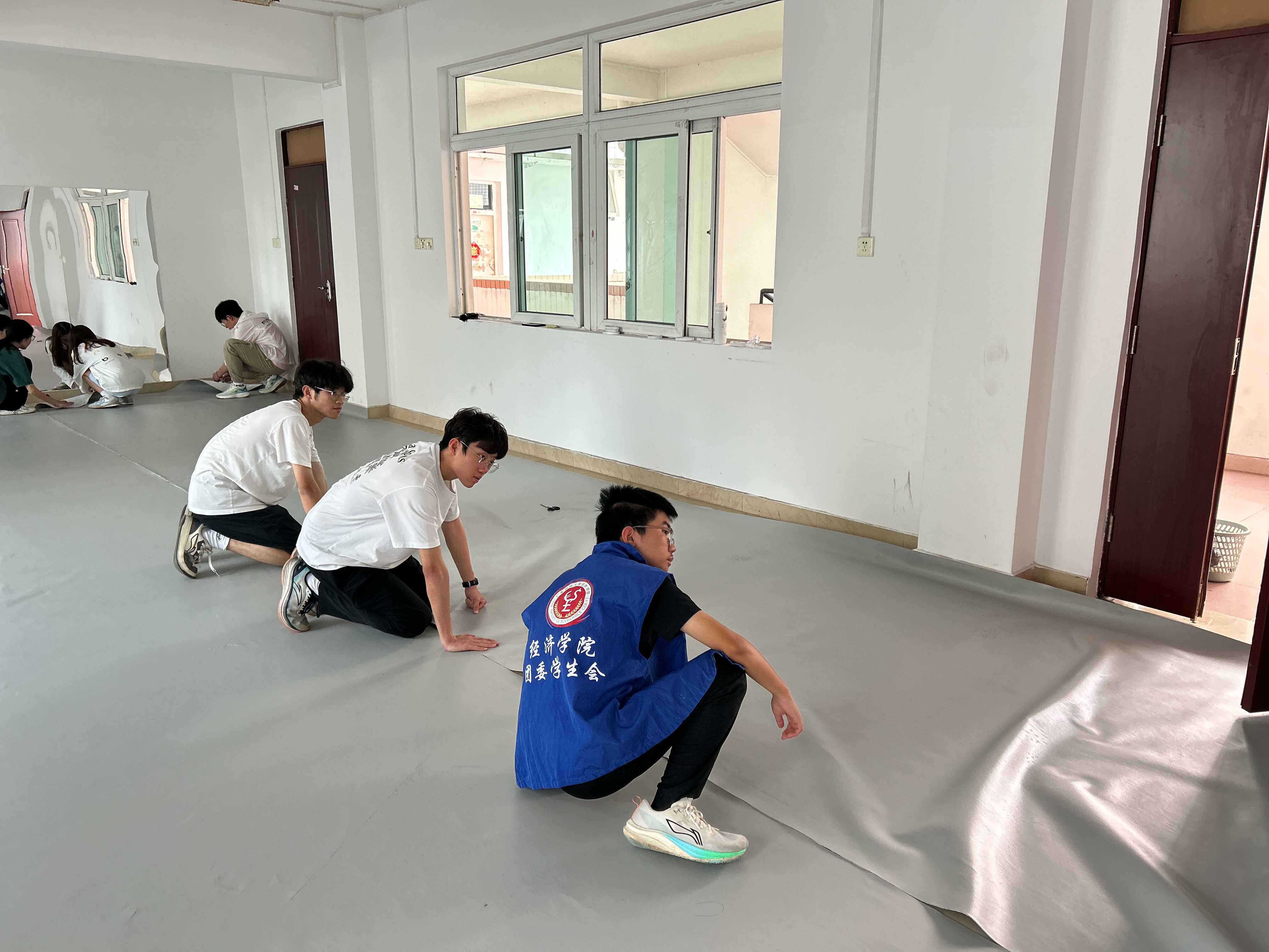 活动现场,同学们先对舞蹈室进行室内清洁,打扫地面、搬移杂物,随后讨论镜子安装、地胶铺设方案。负责铺设地胶的同学反复测量位置、裁剪尺寸,确保贴合平整;负责安装镜子的同学仔细调整角度与高度,保证使用安全与视觉效果。在舞蹈室环境美化过程中,大家不断交流想法,对细节进行调整,力求让空间更加实用、美观。经过共同努力,原本略显单调的舞蹈室逐渐变得整洁明亮,视觉也更加舒适。